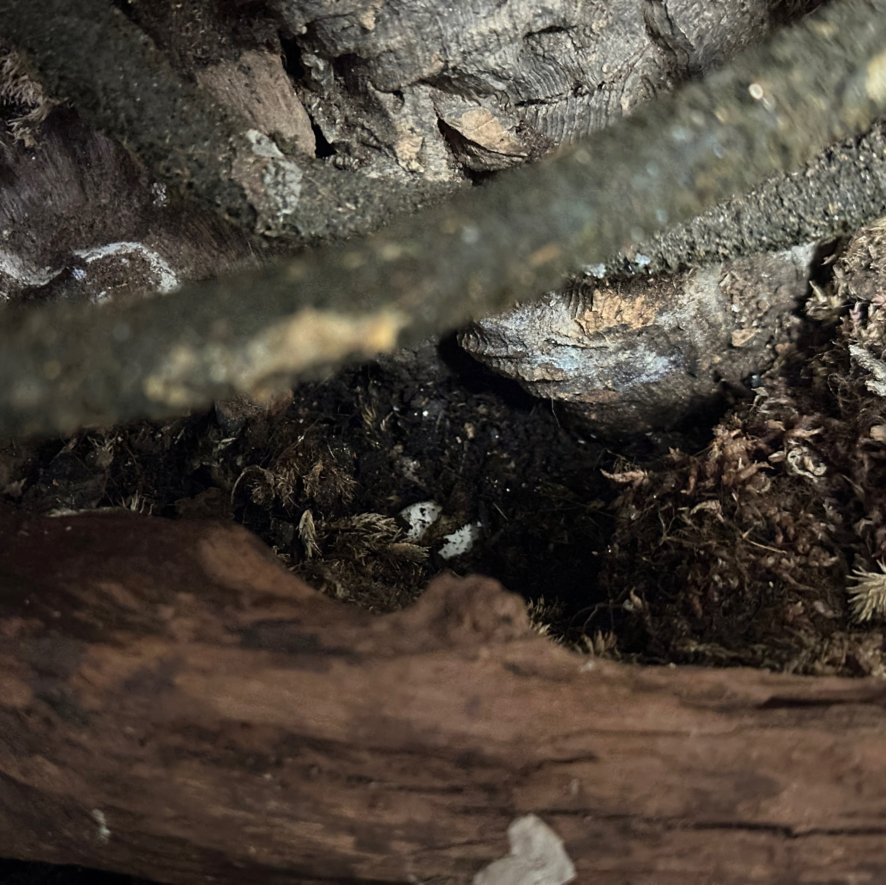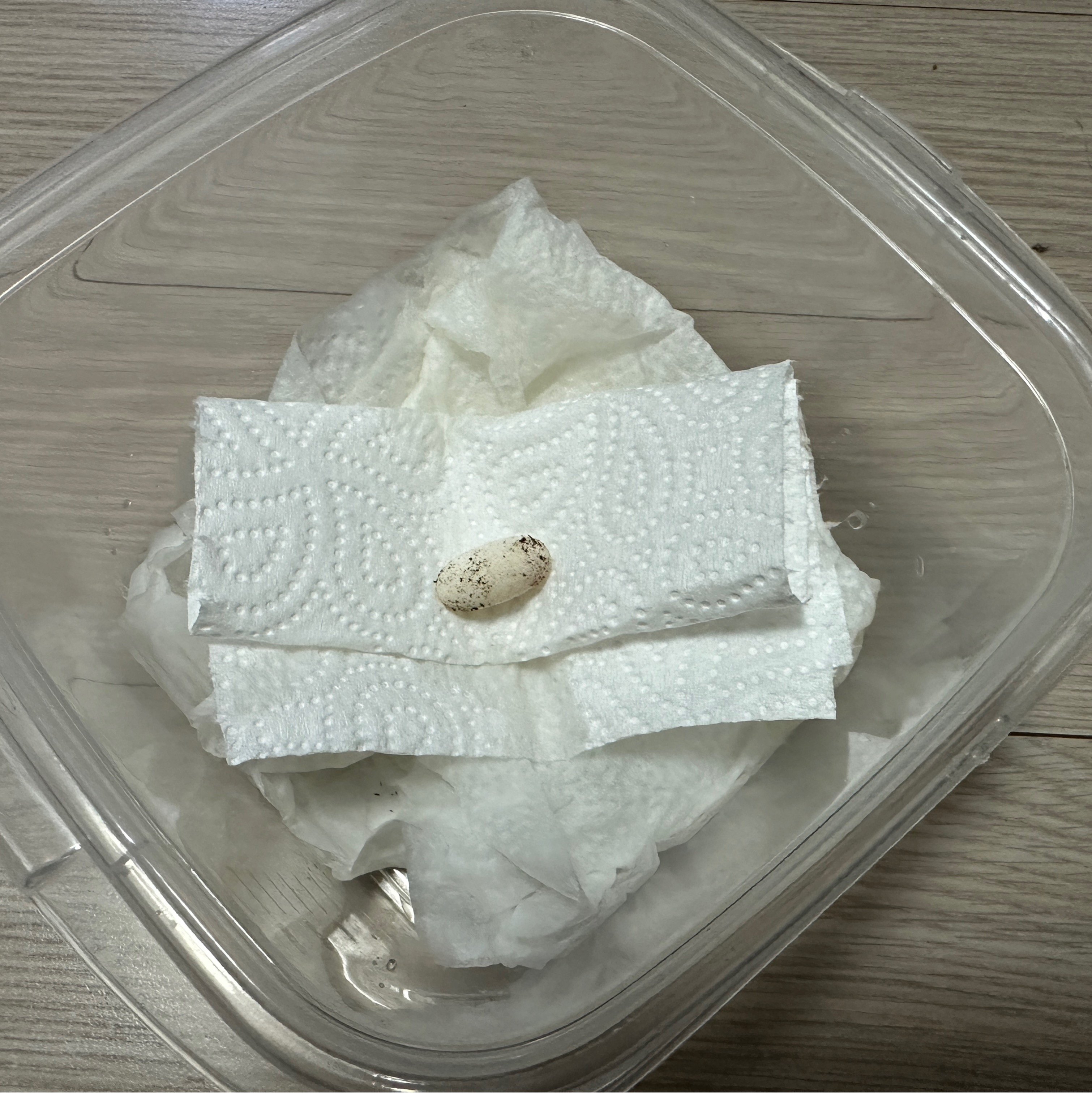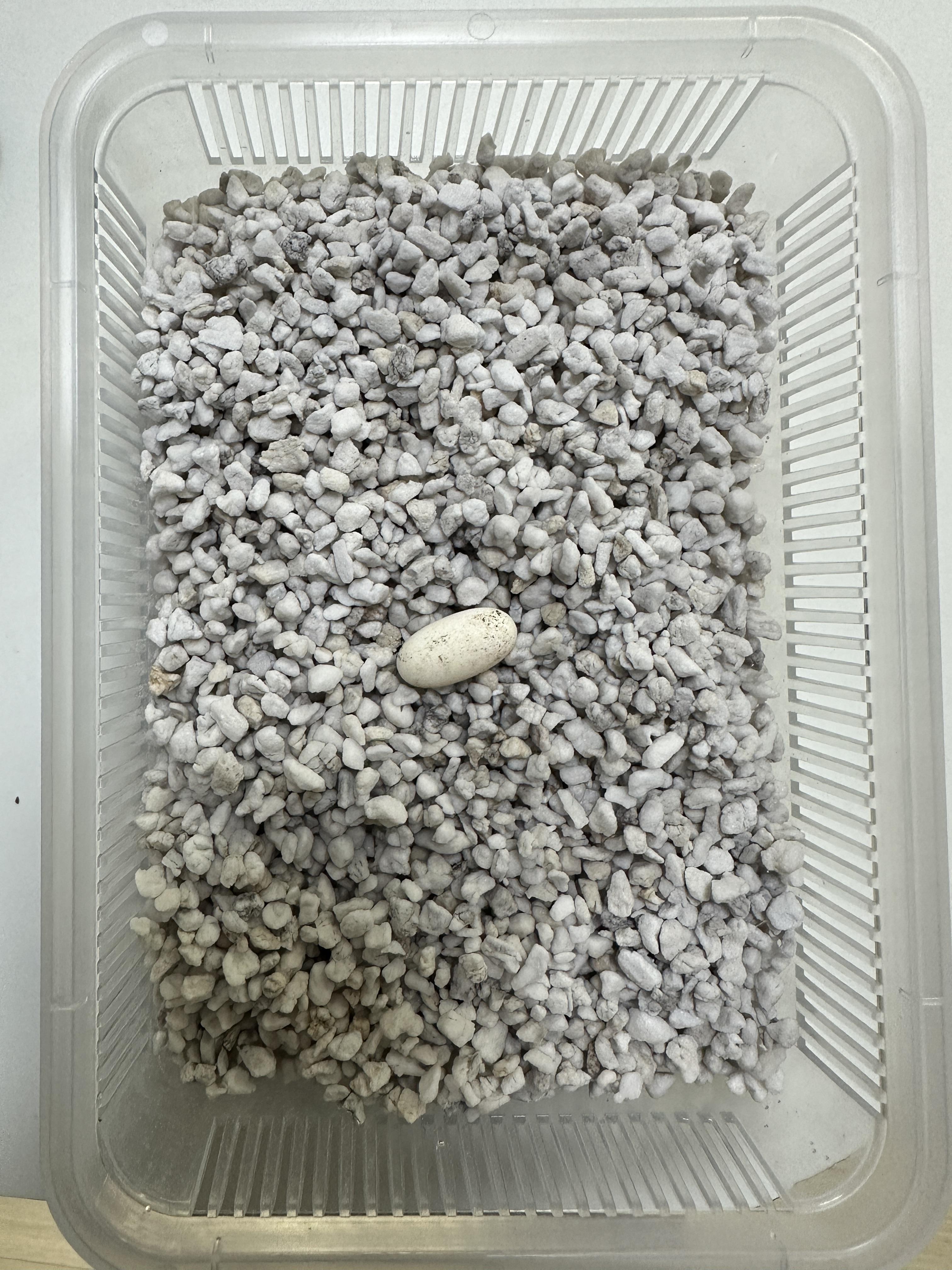 바닥재가 파헤쳐져 있길래 흙을 조금 치워보니 알이 묻혀있었습니다. 검란을 해보니 붉은 동그라미가 보입니다. 유정란이 맞는 것 같습니다..!