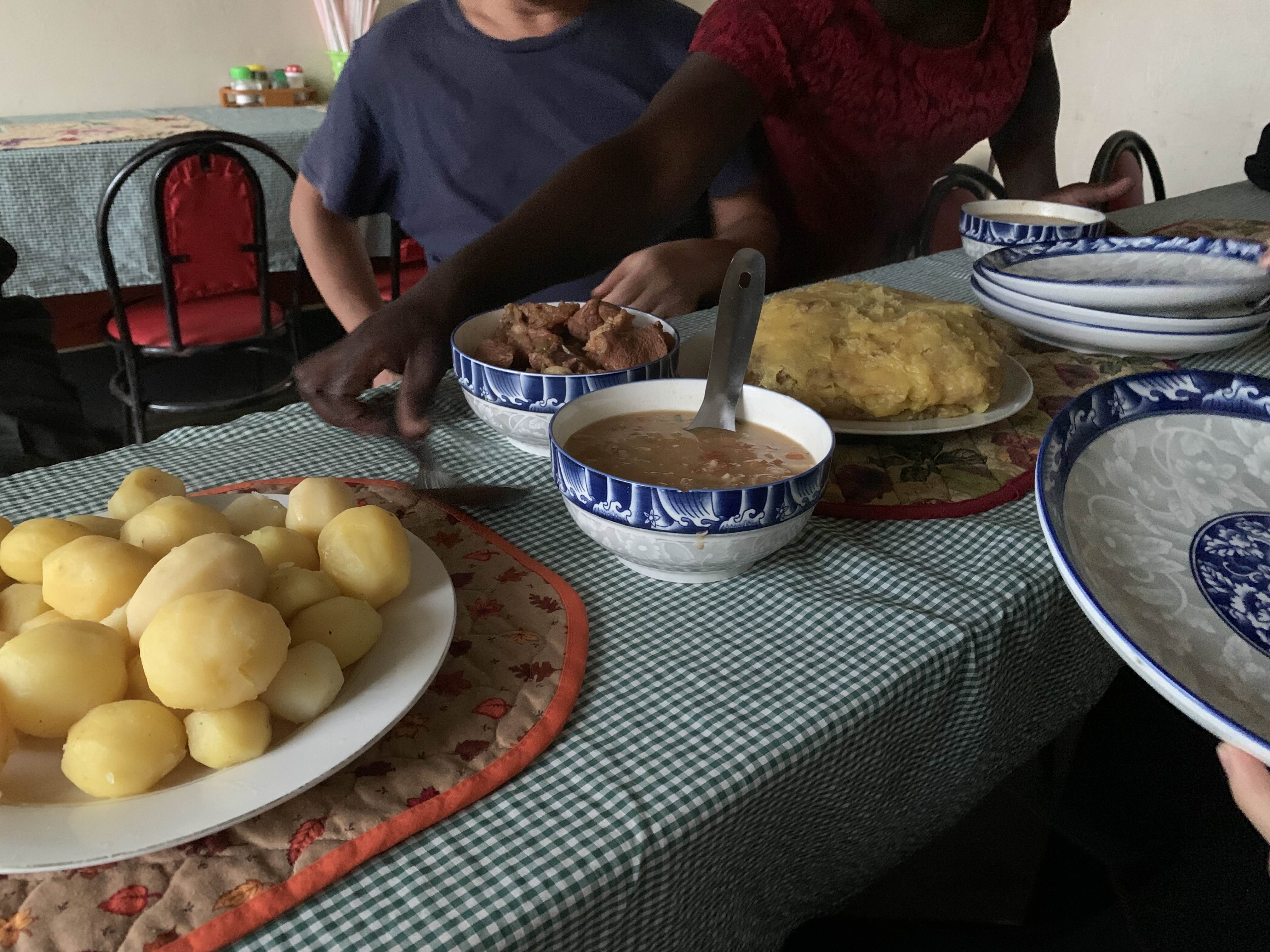 삶은 고기, 우거지국과 비슷한 수프, 감자, 바나나로 만든 밥(밥은 아니지만 하는 역할은 밥이라고 보면 될 듯)