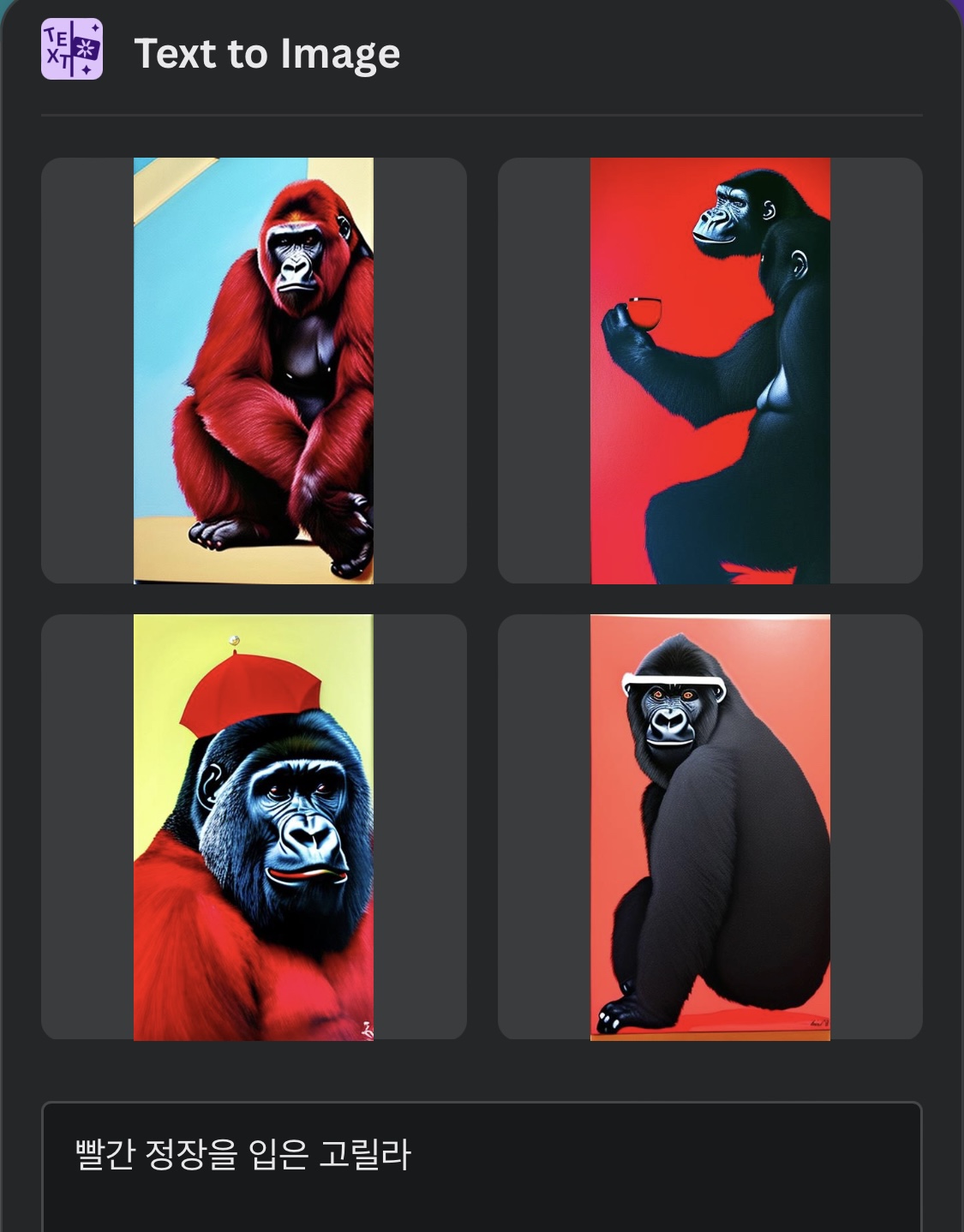 다른 명령어도 한 번 입력해보겠습니다. 참고로 이번에는 한글로 입력했습니다. ‘빨간 정장을 입은 고릴라’