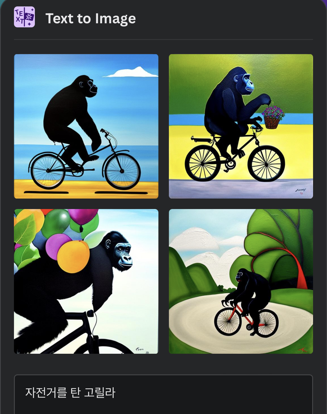‘천재 고릴라가 컴퓨터 앞에서 일하는 모습’을 요청했는데, 제 요청과는 상관없이 그냥 고릴라를 보여주네요. 조금 실망입니다.