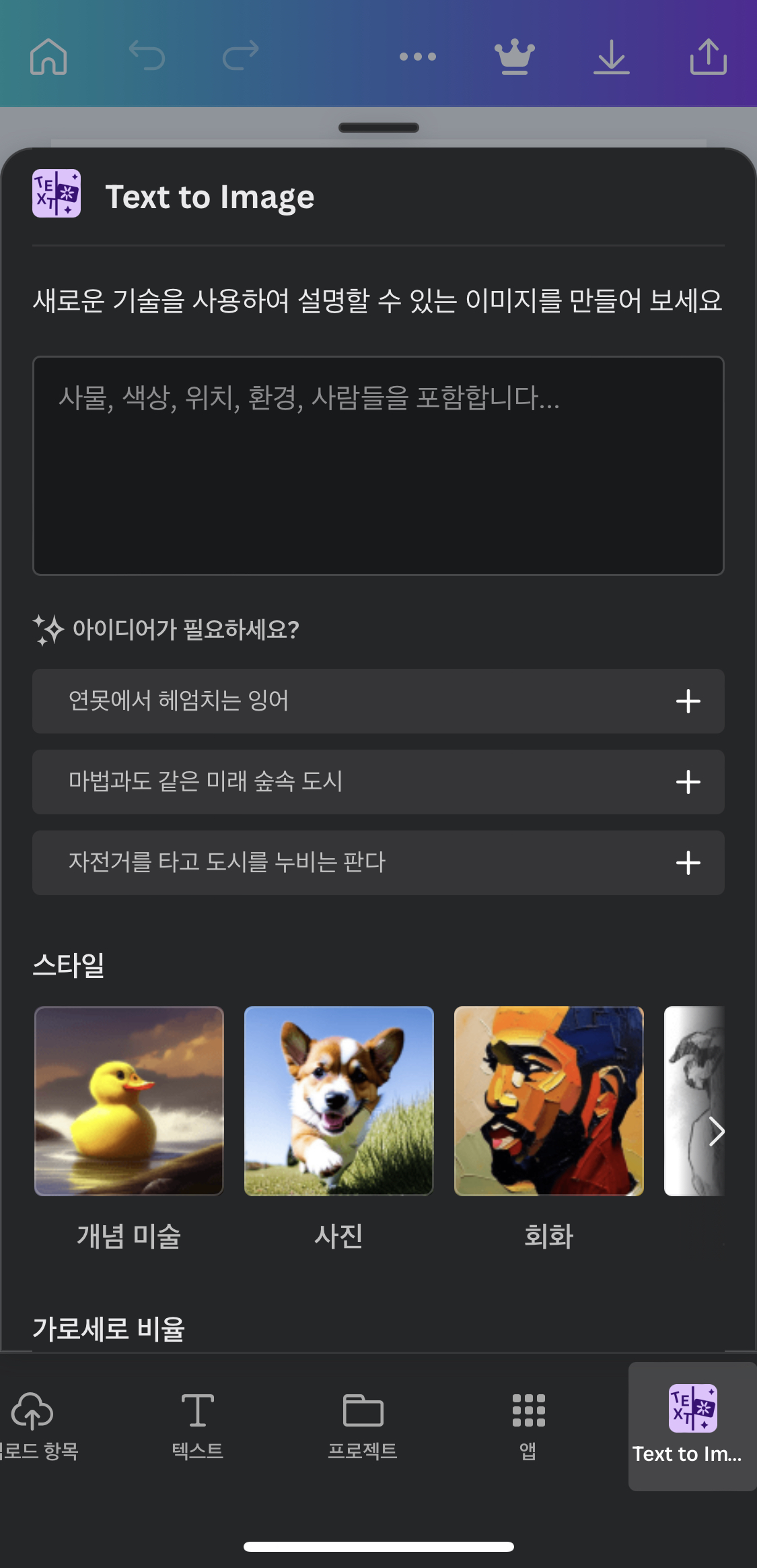 1단계: 칸바 앱/웹에서 텍스트-투-이미지 기능 접근하기