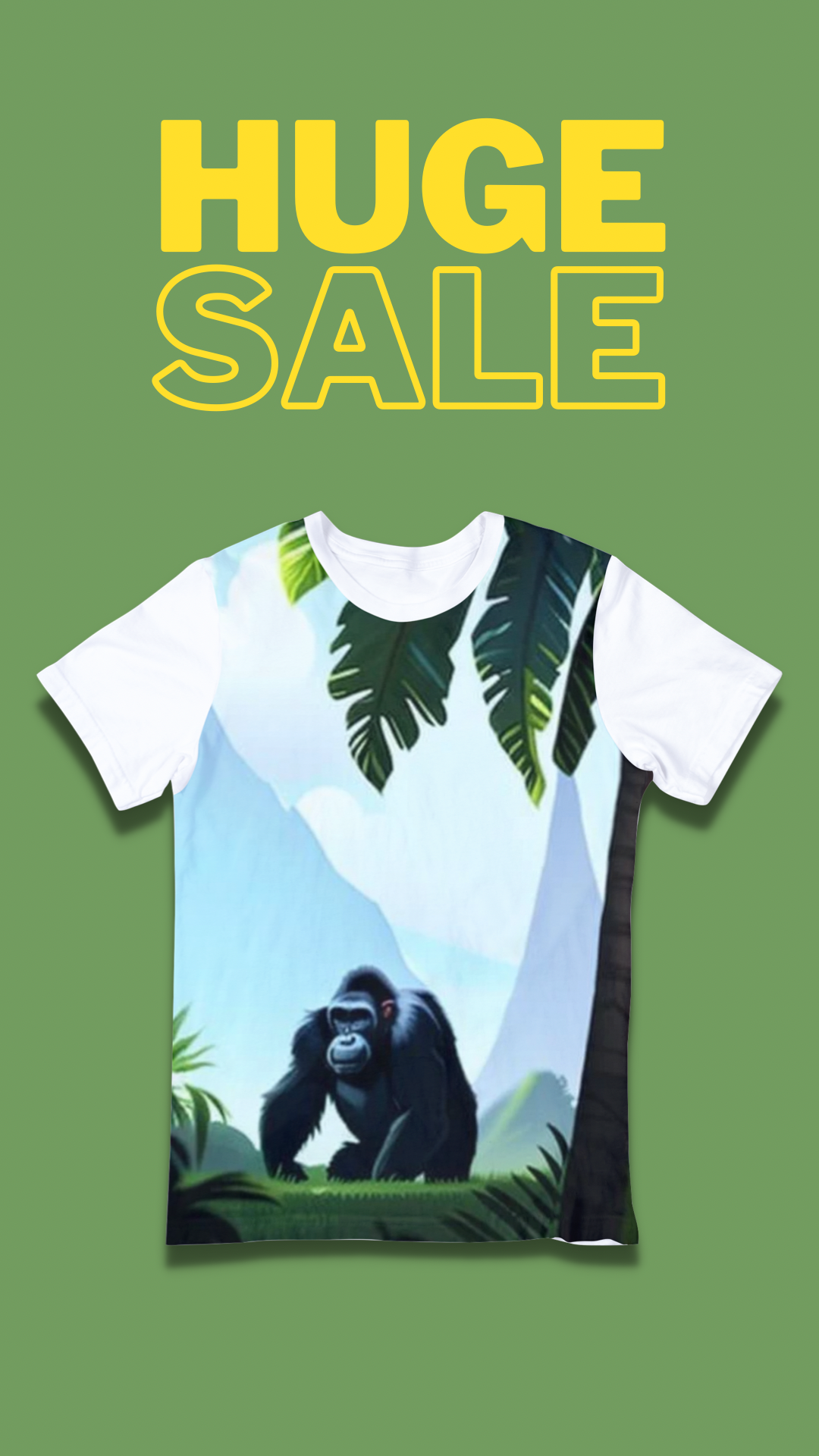 이제 칸바의 기존 기능을 이용합니다. 그림을 선택하고 효과에서 스마트목업 기능을 활용하여 티셔츠 목업을 만들고, 이 티셔츠에 그림자 효과를 주었습니다. 배경색과 텍스트를 간단히 추가해봤습니다. (현실에는 없지만) 정글 고릴라 티셔츠의 세일을 홍보하는 디자인이 완성되었습니다!