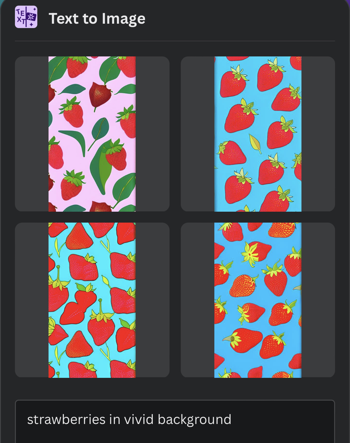 스타일에서 ‘패턴’이라는 스타일이 있길래 ‘형형색색의 배경에 있는 딸기’를 입력해봤습니다. 이건 좀 괜찮은 것 같습니다.