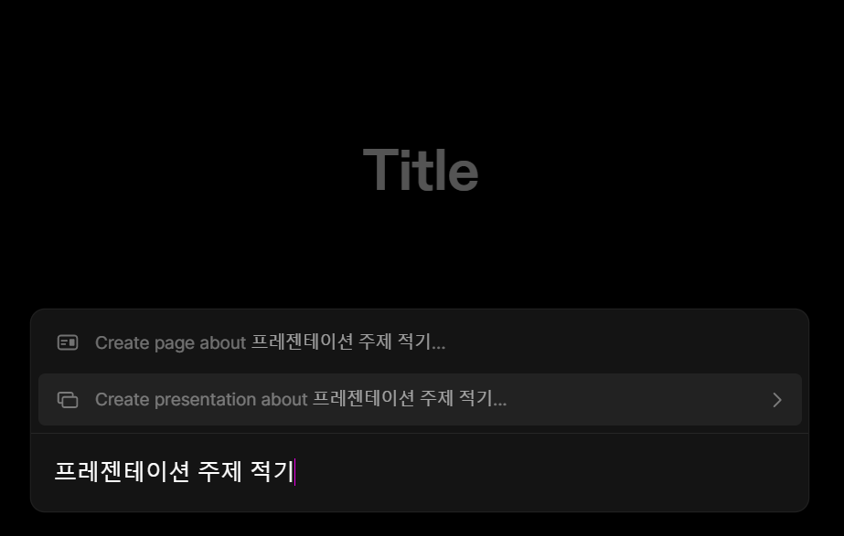 사용 방법은 더할 나위 없이 간단한데요. 'create' 버튼을 눌러 새로운 프레젠테이션을 만들고 원하는 주제를 적으면 됩니다. 한국어로도 주제를 적을 수 있지만 결과는 영어로만 생성되는 것을 확인했습니다.