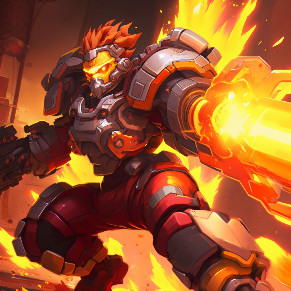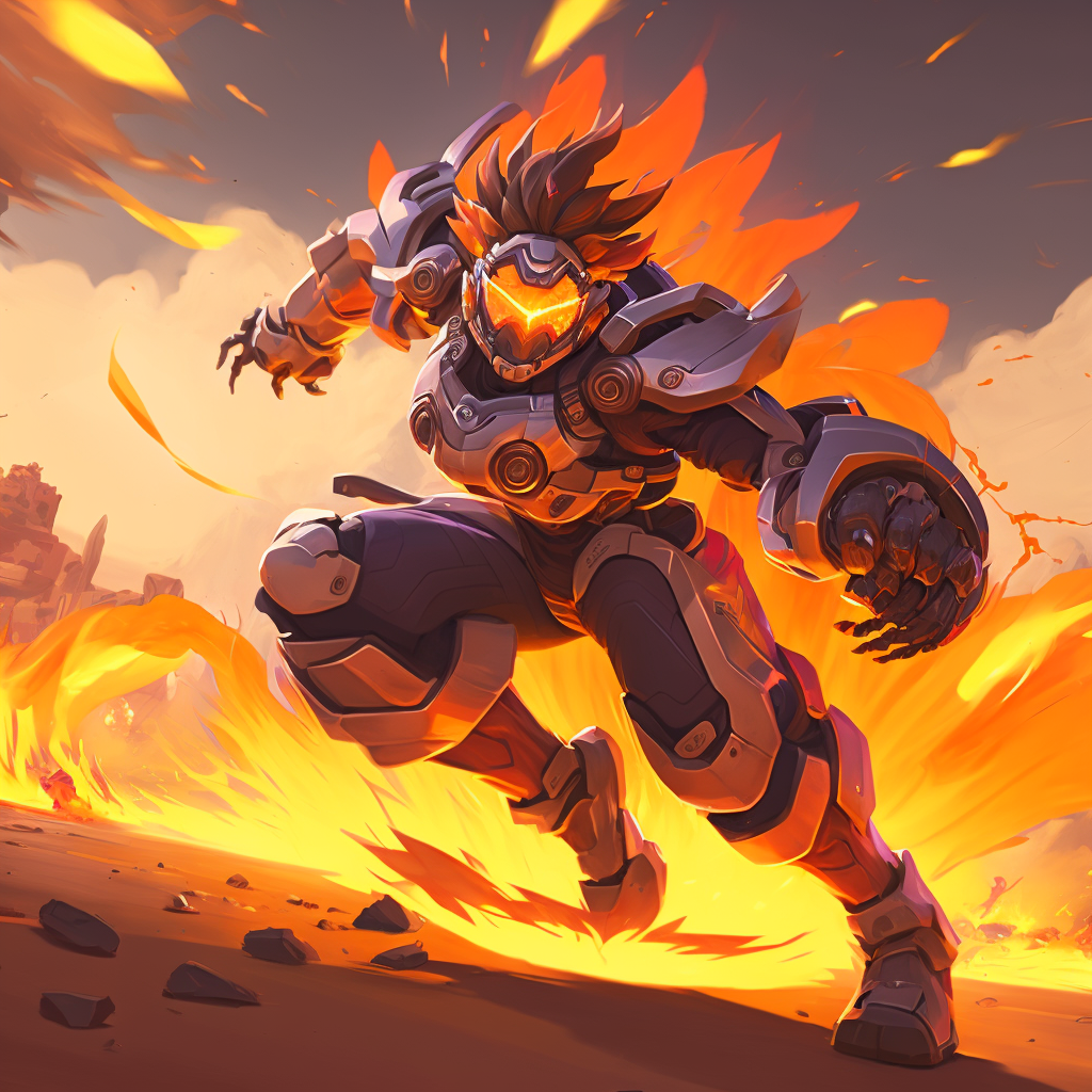 디자인 및 개념: 블레이즈는 화염 조종사로, 기술적으로 뛰어난 방어수단을 사용하여 공격과 방어 모두에 능한 캐릭터입니다. 불꽃을 이용해 적을 공격하거나, 아군을 보호하는 능력을 가지고 있습니다. 디자인은 미래적인 화재 진압 복장과 장비를 착용한 모습입니다.