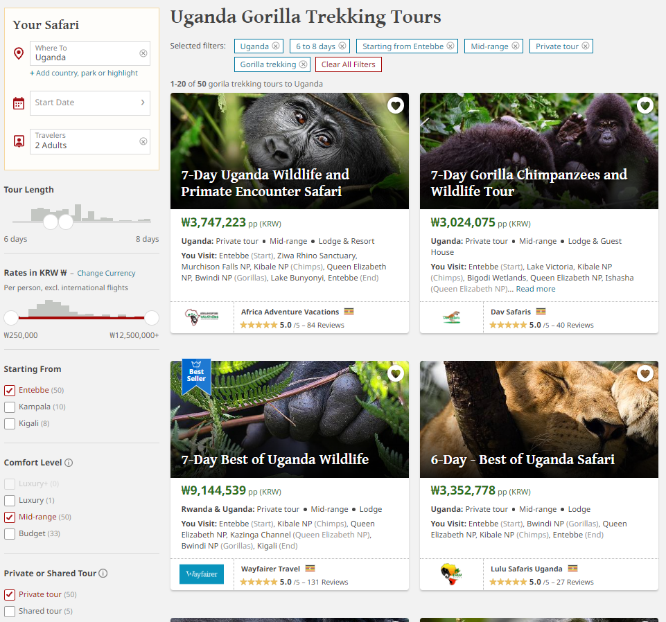 아래 이미지는 임의로 원하는 조건을 걸어 검색해본 결과이다. 2명/여행기간은 6-8일/엔테베 출발(공항이 엔테베에 있다)/중간급 예산/다른 사람과 함께 동행하지 않는 프라이빗 투어/고릴라 트래킹 필수.