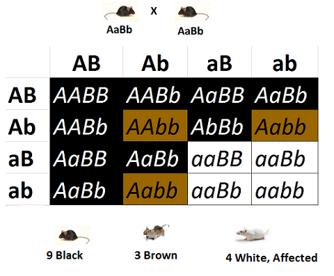 aaBB, aaBb 또는 aabb: 알비노 쥐 (a 열성 유전자만존재하므로 색소가 생성되지 않음; 따라서 B 유전자에 관계없이 알비노임)