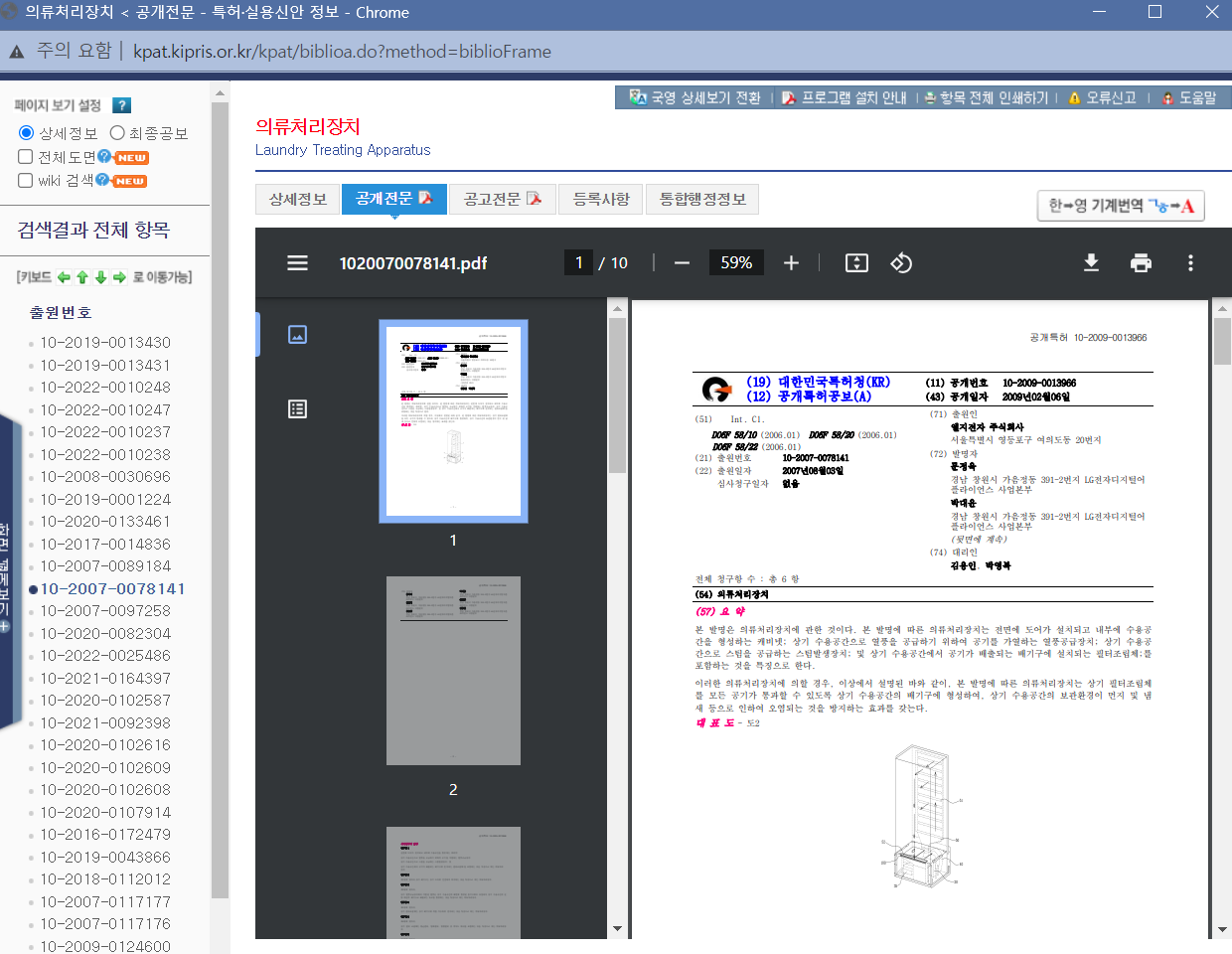 키프리스에서 '의류 스타일러 엘지전자'로 검색해보았습니다. 수많은 특허들이 있습니다.