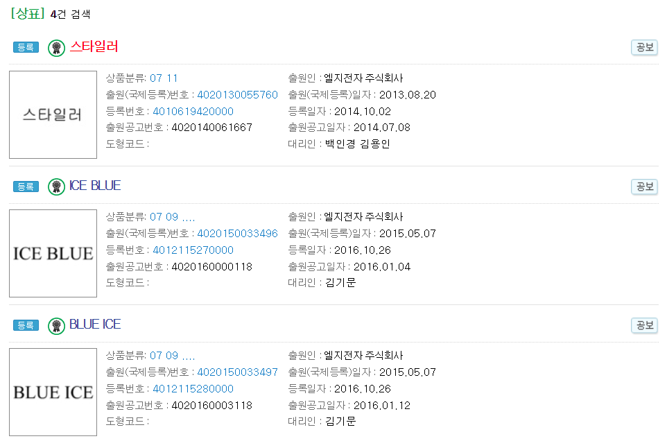 또한 '스타일러'라는 명칭에 상표권을 엘지전자가 가지고 있음을 확인할 수 있습니다.