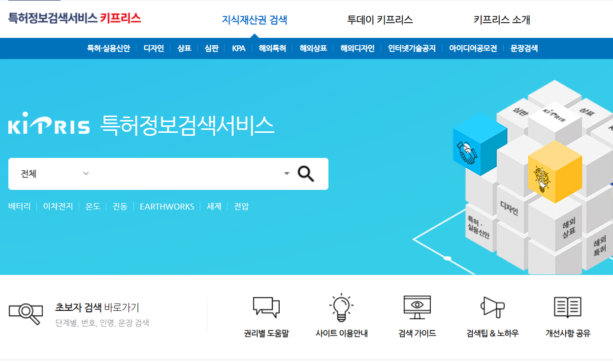 키프리스 홈페이지에 따르면 키프리스는 특허청이 보유한 국내외 지식재산권 관련 모든 정보를 데이터베이스 구축하여, 이를 이용자가 인터넷을 통하여 검색 및 열람할 수 있도록 한국특허정보원이 운영하는 대국민 특허정보검색 서비스입니다. 공익에게 정보를 제공하려는 취지가 느껴지네요.