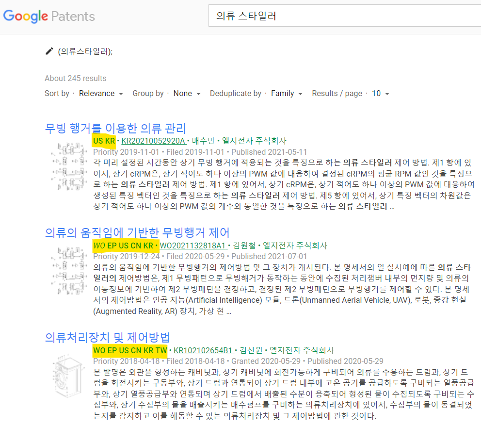 키프로스와 마찬가지로 '의류 스타일러'를 검색해보았습니다. 1차 검색 결과에서 해당 특허가 다른 국가에서 어떻게 출원되고 있는지의 현황도 간단히 파악할 수 있습니다.